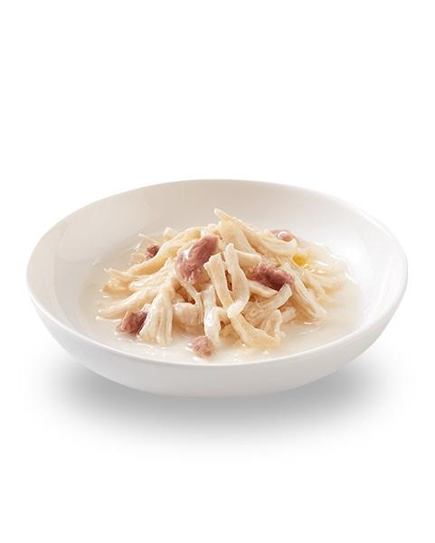Une recette Schesir à base de vrais filets de poulet , associés à un savoureux canard , préparé dans leur eau de cuisson , pour les chats qui aiment une saveur et une texture naturelles .