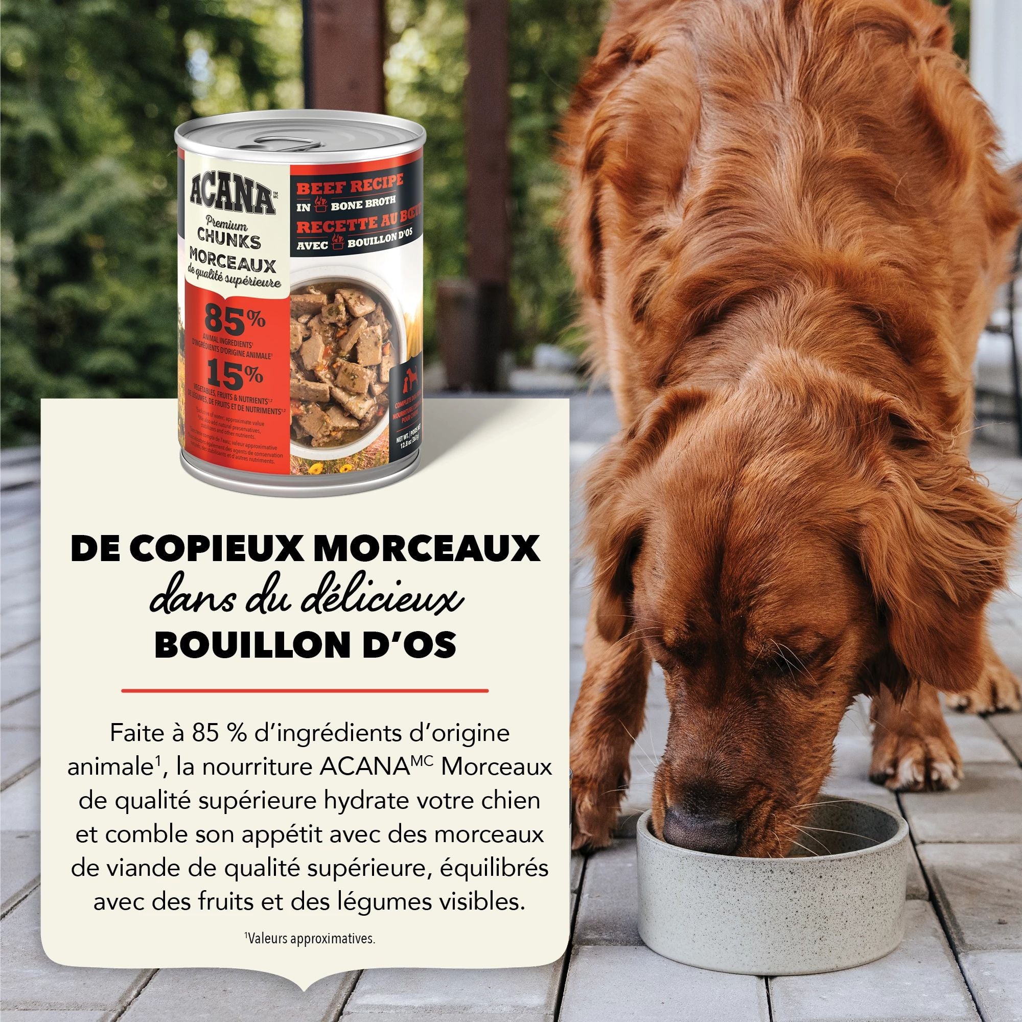 Ne vous arrêtez pas au premier ingrédient avec les recettes ACANAMD comme les Morceaux de qualité supérieure ACANA, confectionnés avec soin du début à la fin. Notre Recette au bœuf avec bouillon d’os est confectionnée avec 85%* d’ingrédients d’origine animale prenant la forme de morceaux de bœuf et d’agneau de qualité supérieure. Elle est équilibrée avec 15%*† de fruits et légumes visibles dans du bouillon d’os savoureux dont votre chien raffolera. Ajoutez-la sur les croquettes ACANA préférées de votre chien en guise de garniture humide avec un éclat de saveur, ou offrez-lui ce petit plaisir seul en guise de repas.