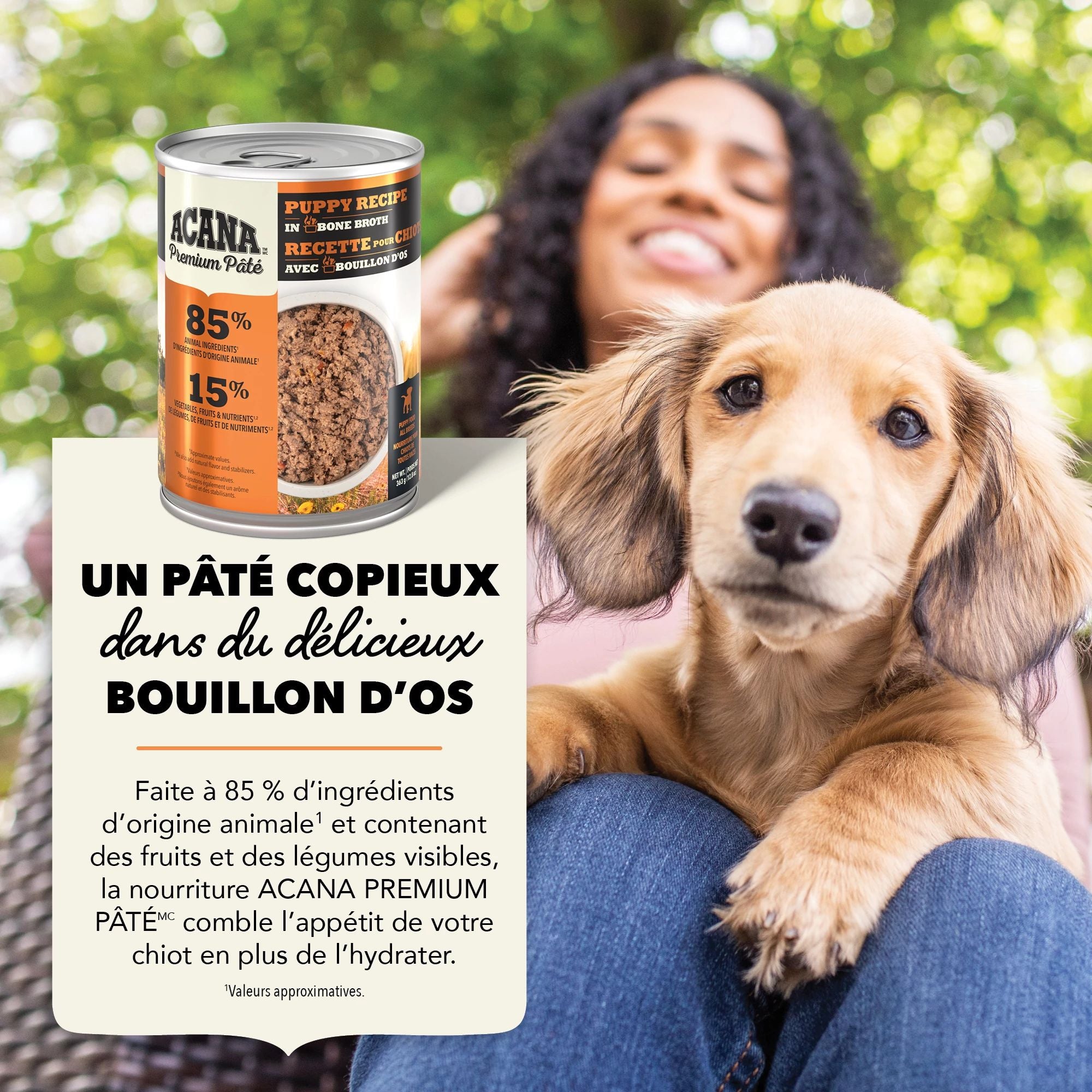 Ne vous arrêtez pas au premier ingrédient avec les recettes ACANAMC comme les Morceaux de qualité supérieure ACANA, confectionnés avec soin du début à la fin. Notre Recette avec bouillon d’os pour chiots est un pâté spécialement formulé pour favoriser la croissance et le développement de votre chien. Cette recette, contenant 85%* d’ingrédients d’origine animale de qualité supérieure comme du poulet, de la dinde et du hareng, est équilibrée avec 15%*† de fruits et légumes visibles. Le savoureux bouillon d’os rehausse la saveur et l’aspect nutritif de cette recette. Ajoutez-la en guise de garniture humide aux croquettes ACANA préférées de votre chiot pour un repas nutritif, ou servez-lui cette recette seule en guise de repas exquis.