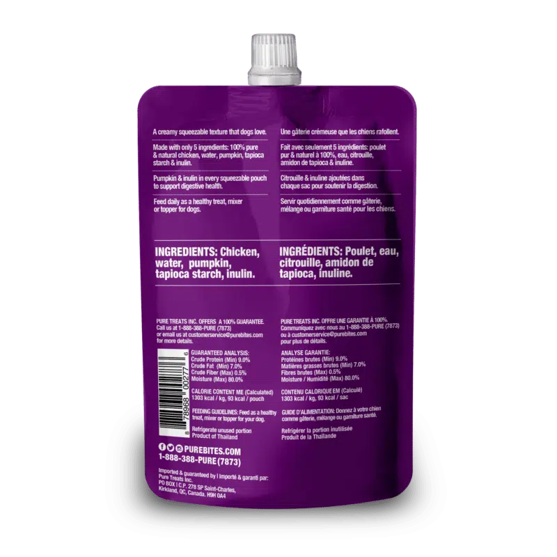 Chez PureBites, voici ce que nous disons toujours aux parents d’animaux de compagnie : « Allez-y, examinez nos ingrédients ». Le support de santé quotidien PureBites Plus Crémeux Intestin est composé de seulement 5 ingrédients simples de qualité alimentaire humaine que vous pouvez lire, prononcer et en lesquels vous pouvez avoir confiance : du poulet pur à 100 %, de l’eau, de la citrouille, de l’amidon de tapioca et de l’inuline. Pas de colorant artificiel, d’agent de remplissage ou d’édulcorant. La formule PureBites Plus Crémeux Intestin contient de la citrouille et de l’inuline dans chaque sachet compressible pour favoriser la santé digestive. Nos gâteries sont fraîchement préparées dans une texture crémeuse et dans un sac compressible amusant et interactif, emprisonnant ce goût dont les chiens raffolent et la nutrition de qualité supérieure que leurs parents adorent