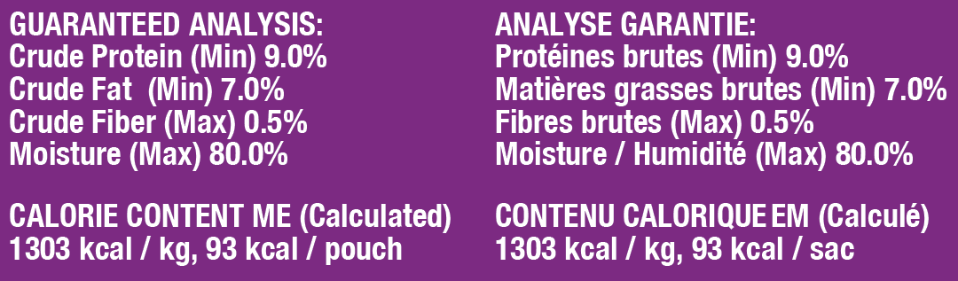 - Préparé dans une texture crémeuse que les chiens adorent! Riche en protéines et 93 calories par sac. Sans ajout de colorant artificiel, d’agent de remplissage ou d’édulcorant.