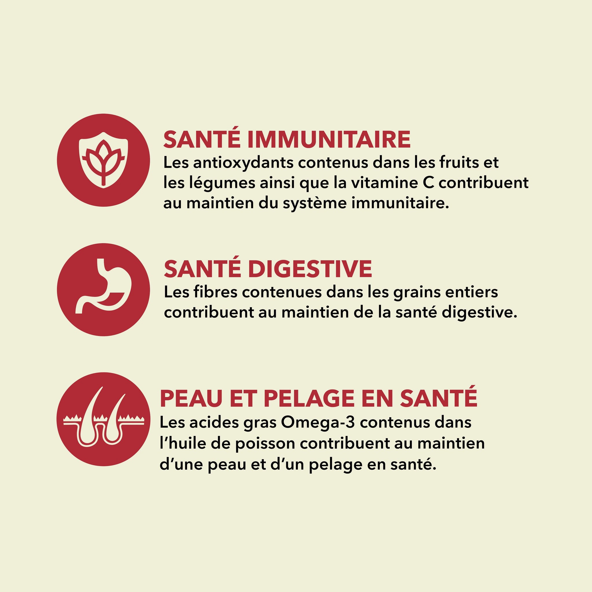 - Composée de 50%1 d’ingrédients d’origine animale de qualité supérieure, équilibrés avec 50% de grains entiers, de légumes, de fruits et de nutriments2